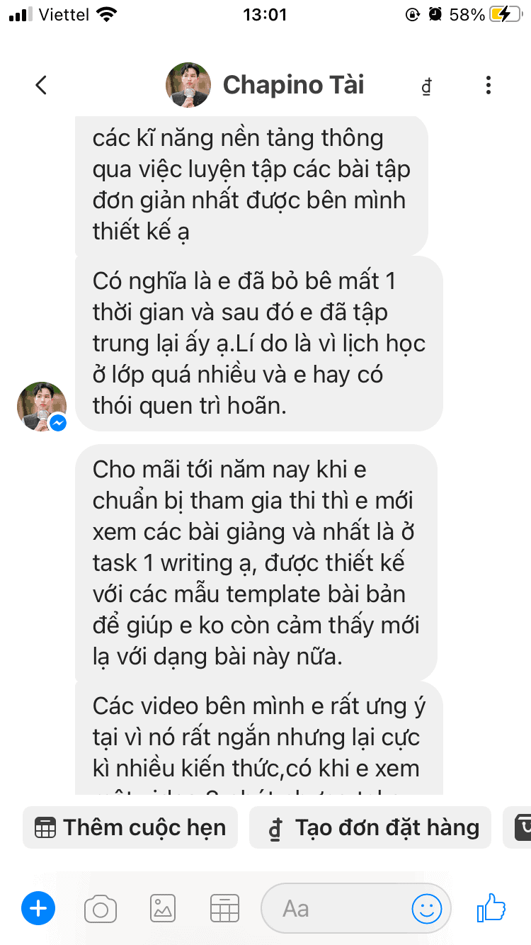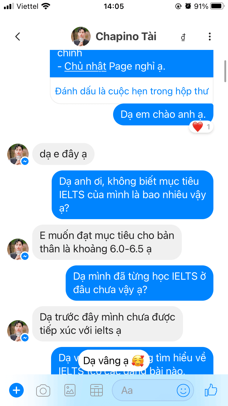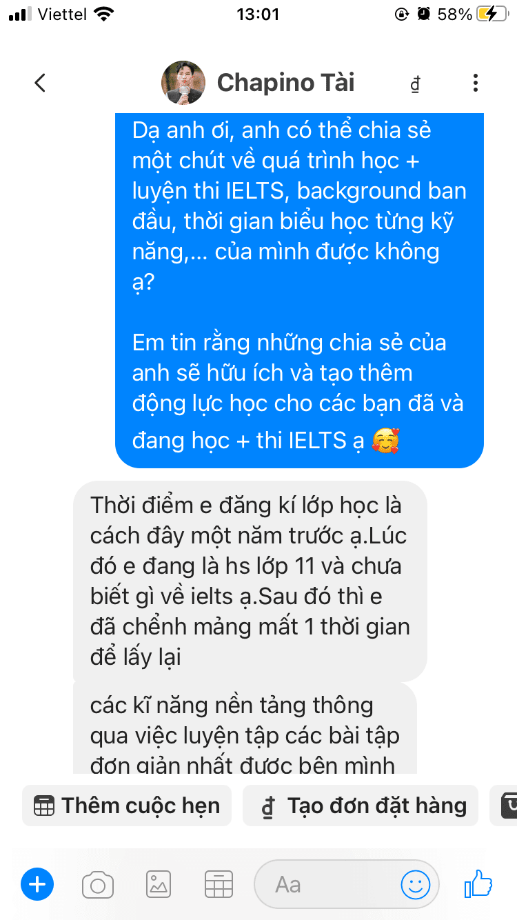 Mục tiêu đặt ra ban đầu của em là khoảng band 6.0-6.5, trong quá trình học em cũng chia sẻ thêm rằng có 1 giai đoạn em bị mất tập trung nên đã trì hoãn việc học IELTS và một phần vì lịch học ở lớp quá nhiều cũng là nguyên nhân khiến thời gian dành cho IELTS của em bị gián đoạn. Nhưng sau giai đoạn đó thì em bắt đầu tập trung học lại chuẩn bị cho kỳ thi IELTS sắp tới để xét tuyển vào đại học.
