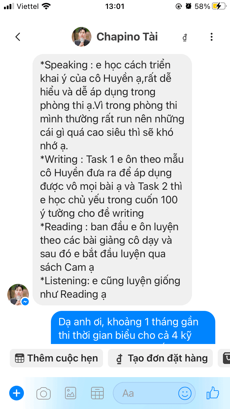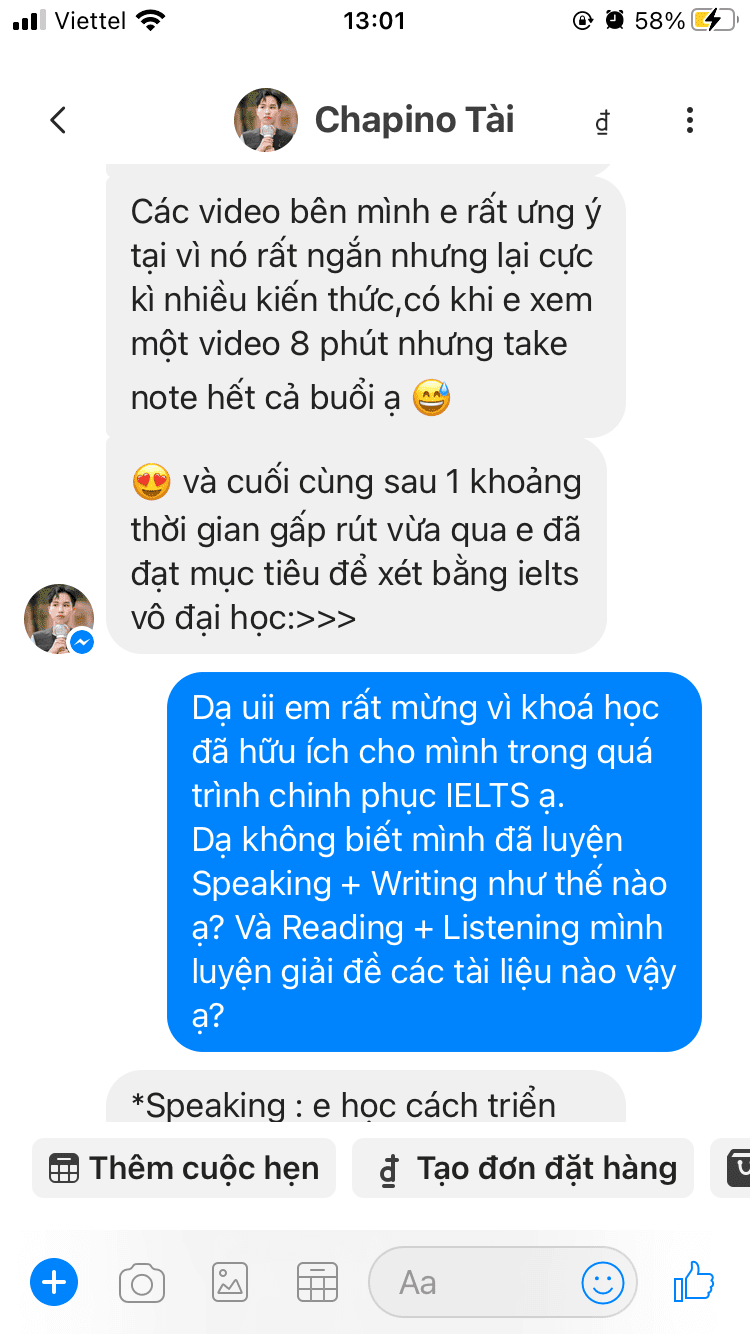 Còn về Reading và Listening ban đầu em học + ôn luyện theo các bài giảng của Huyền đã dạy trong khóa, sau đó áp dụng vào tự luyện giải đề cho đến khi thi với tài liệu em sử dụng để luyện là bộ Cambridge.