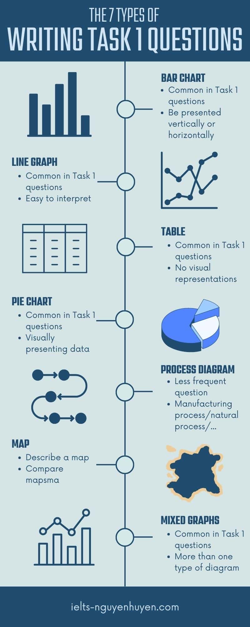 Như đã đề cập ở trên, IELTS Writing Task 1 có 7 dạng bài chính, bao gồm:
