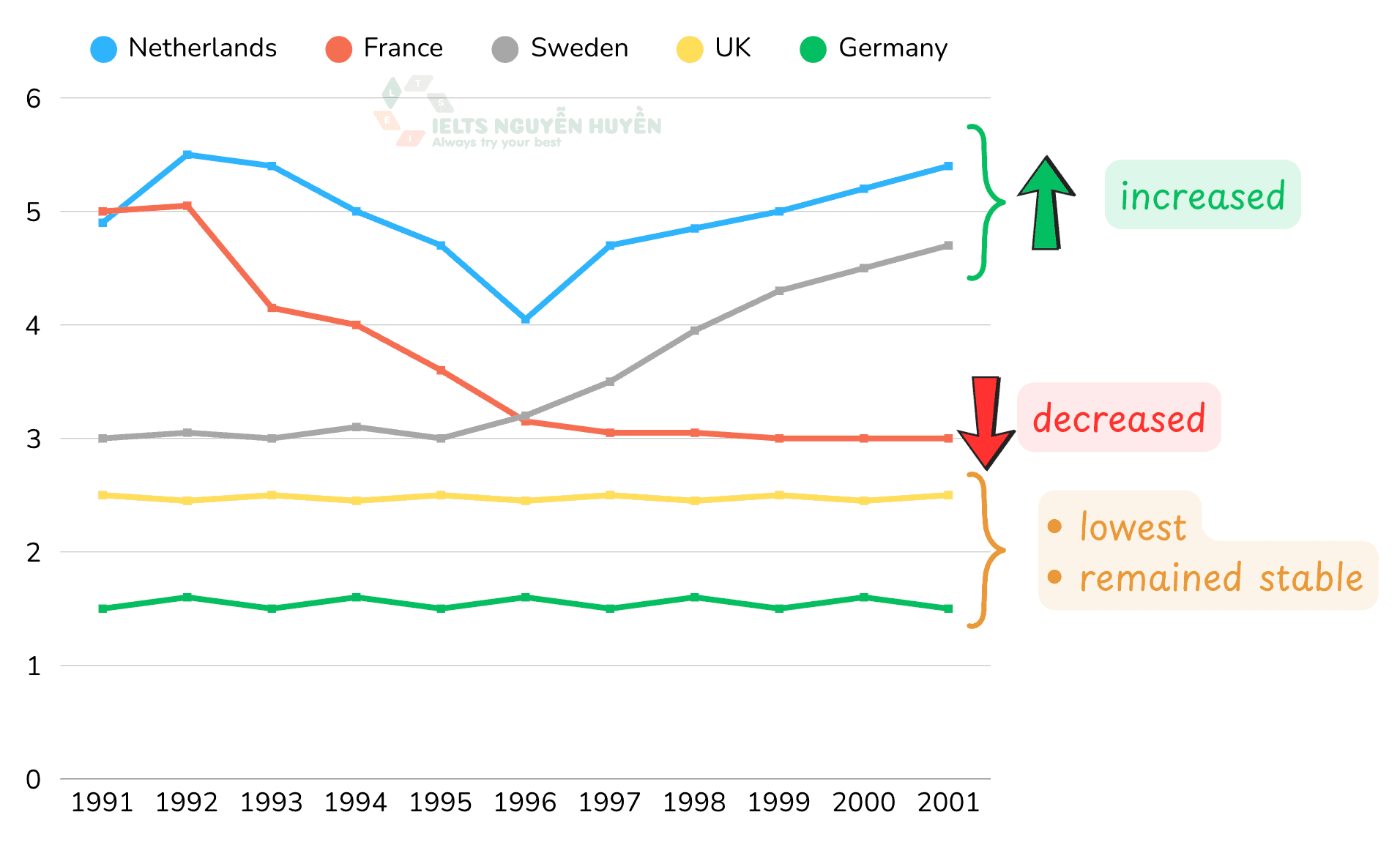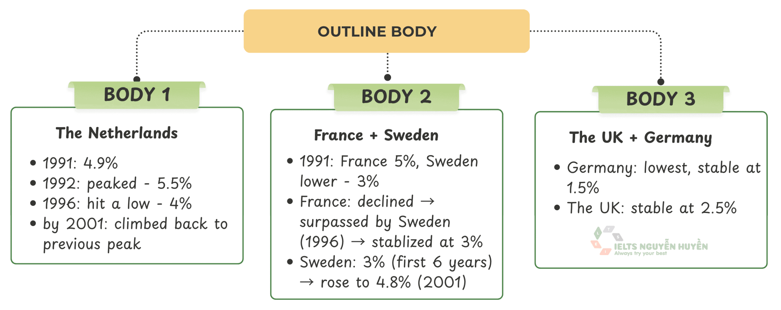 Thường một bài IELTS Writing Task 1 Huyền sẽ viết 2 đoạn Body, nhưng bài này Huyền chia theo các xu hướng giống/trái ngược nhau nên Huyền sẽ chia 3 đoạn.