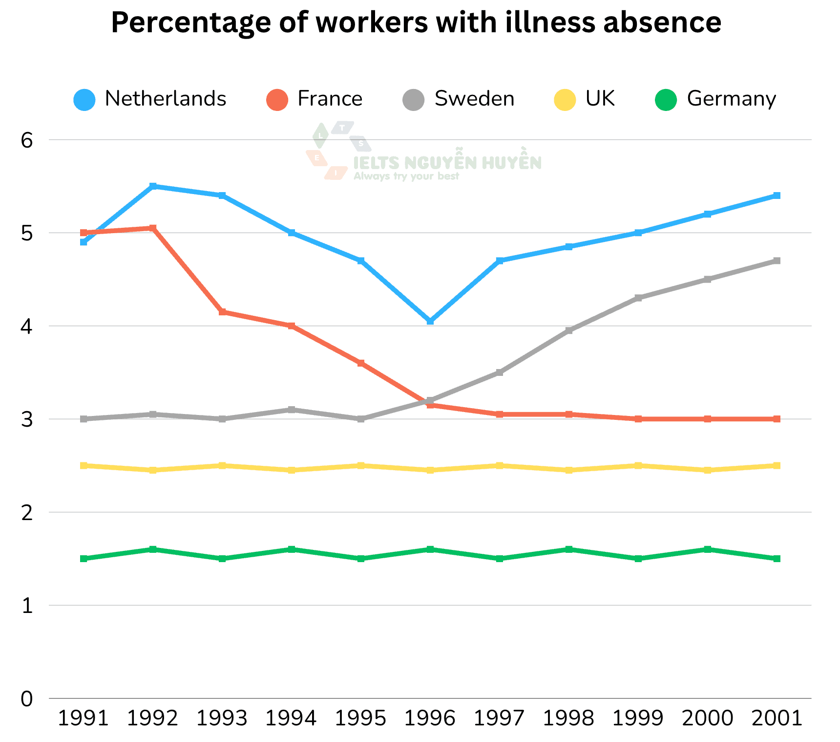 The graph below shows the percentage of workers from five different European countries that were absent for a day or more due to illness from 1991 to 2001.