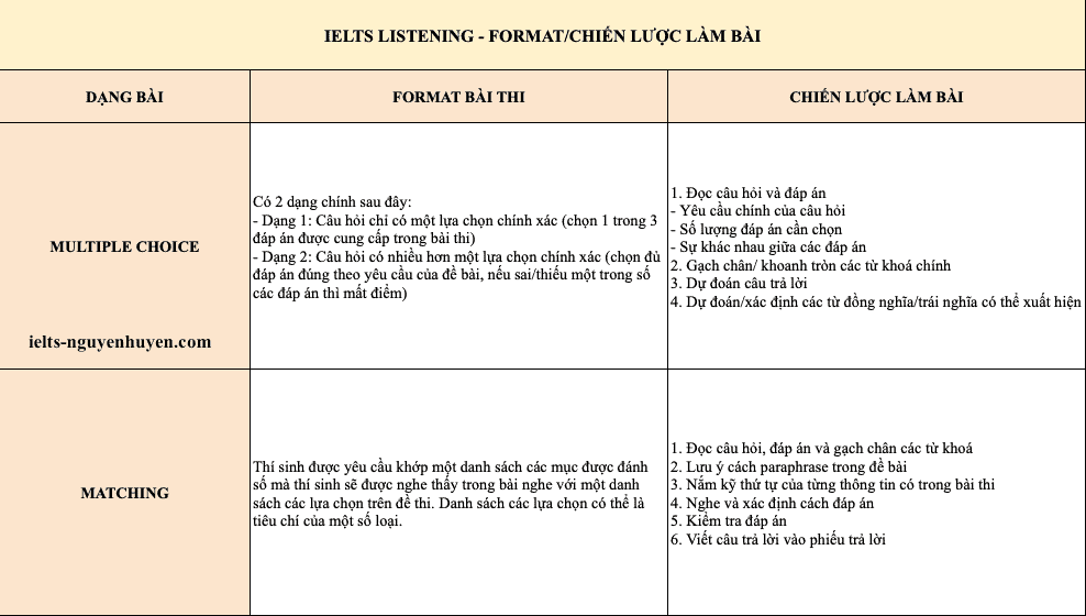 Với mỗi dạng câu hỏi, mình sẽ có cách làm bài riêng. Vì vậy, Huyền sẽ thường tổng hợp lại cách làm bài của từng dạng vào một form chung, sau đó sẽ học cách làm bài của từng dạng đó. Bạn có thể tham khảo mẫu sau đây về chiến lược làm bài thi IELTS Listening: