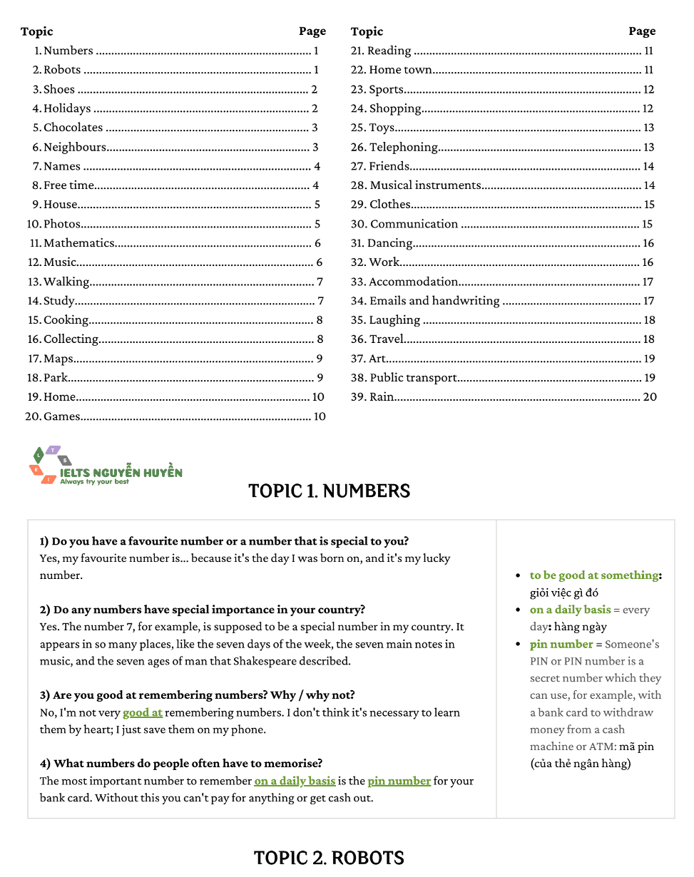 Phần Huyền thích nhất từ ebook là CÁC BẢNG TỪ VỰNG – cung cấp từ vựng cho các chủ đề –> vô cùng hữu ích –> mình có thể áp dụng để tạo ra các câu trả lời cho riêng mình.