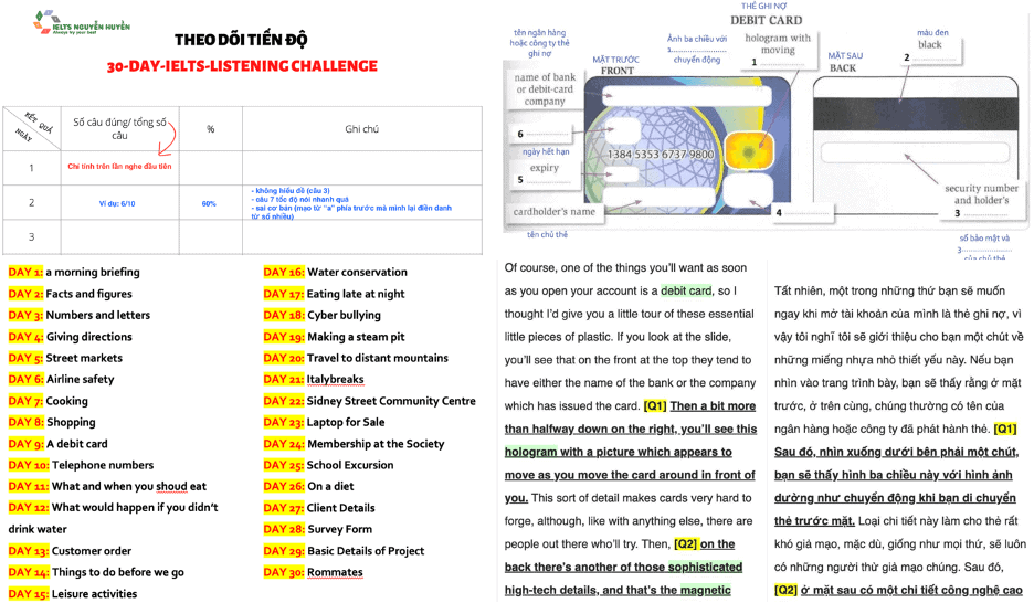 Dự án 30-day-listening-challenge: đây là thử thách do chính Huyền biên soạn để hỗ trợ các bạn trong quá trình cải thiện kỹ năng nghe. Mỗi bài đều có audio, đề, answer key, transcript kèm từ vựng được Huyền rút ra chi tiết.