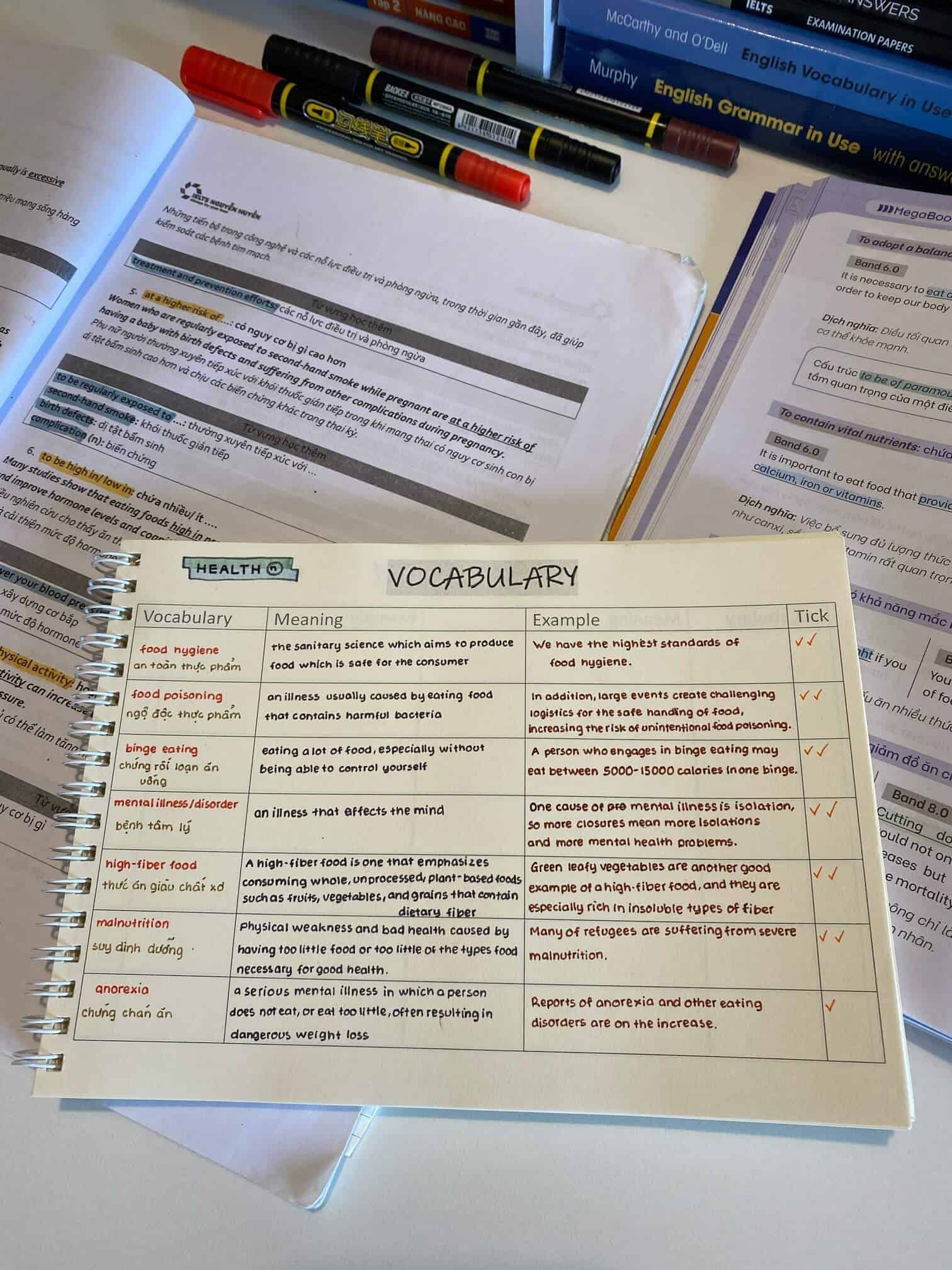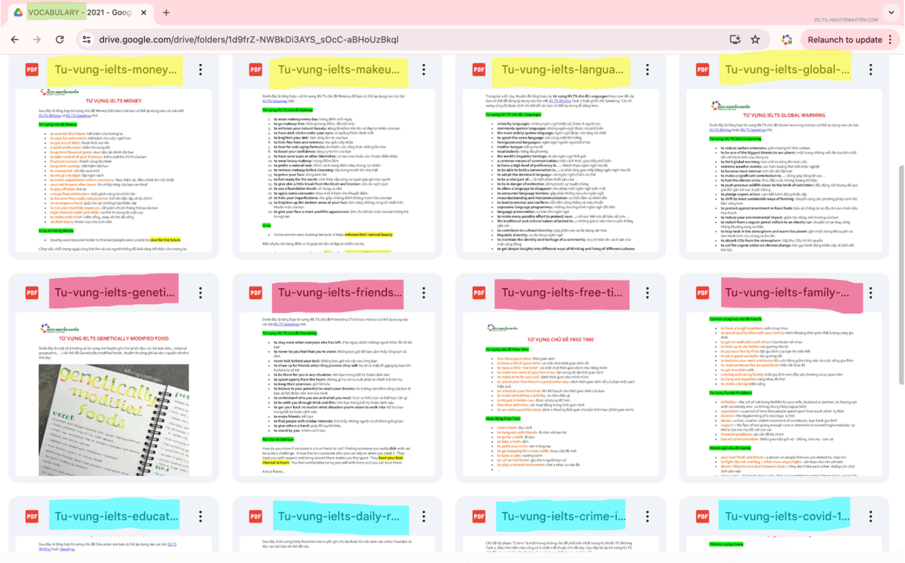 Huyền đã tạo 1 Folder Vocabulary – từ vựng IELTS theo chủ đề, trong đó chứa các bản PDF từ vựng sẽ được update liên tục nếu như có chủ đề từ vựng mới. Ngoài ra Huyền cũng đính kèm thêm phần kinh nghiệm học, cách ghi chép và cả hướng dẫn cách rút từ vựng IELTS khi phân tích bài mẫu cho mọi người luôn.