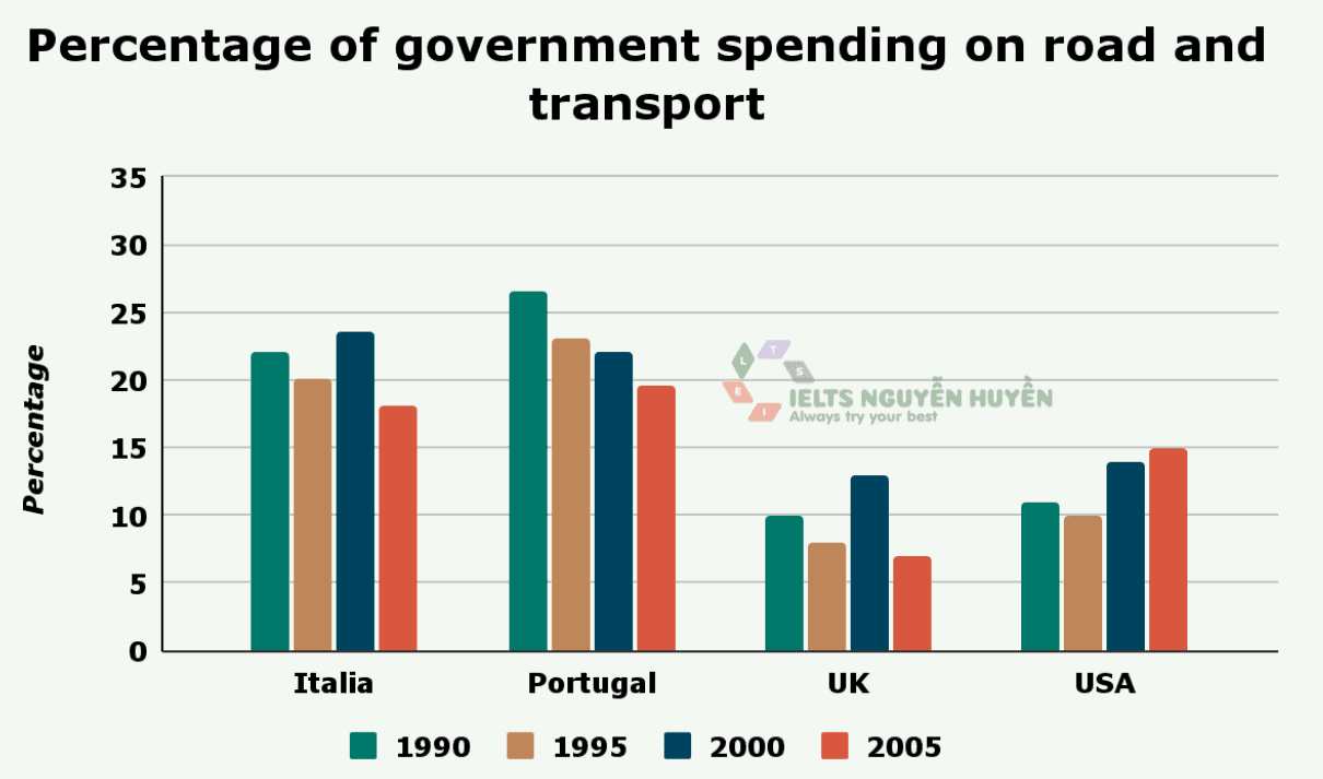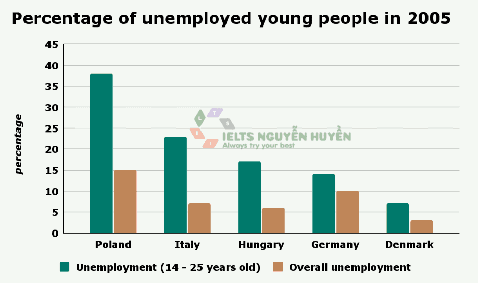 Task 1: The chart below shows the percentage of unemployed people aged between 15 and 24 in five European countries in 2005, compared with the overall percentage of unemployment in those countries.