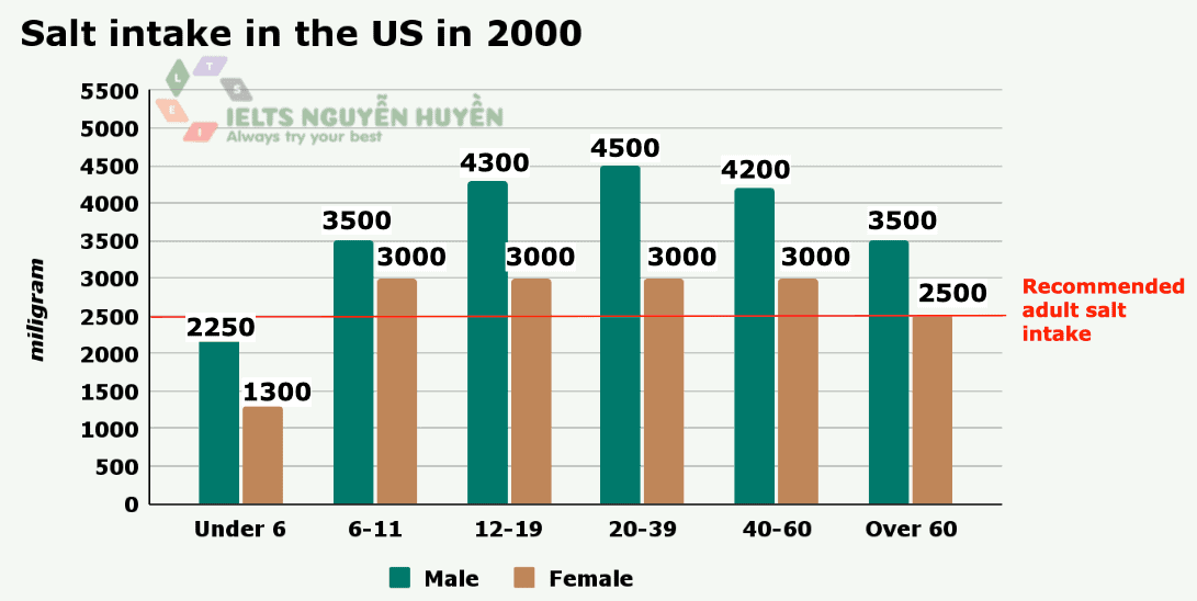 Task 1: The chart shows the information about salt intake in the US in 2000