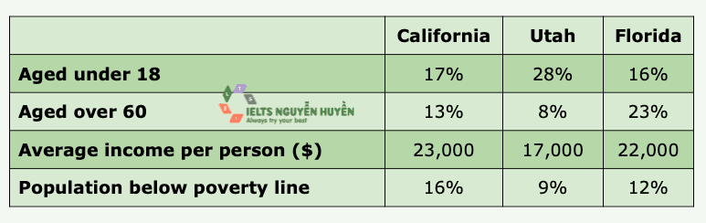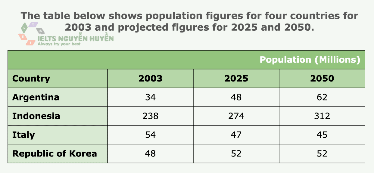Task 1: The table below shows population figures for four countries for 2003 and projected figures for 2025 and 2050.