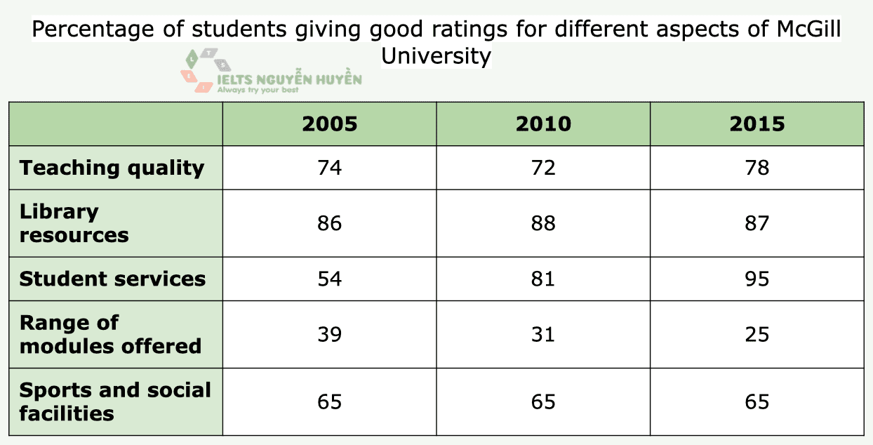Task 1: The table below shows the results of surveys in 2005, 2010 and 2015 about McGill University. Summarise the information by selecting and reporting the main features, and make comparisons where relevant.
