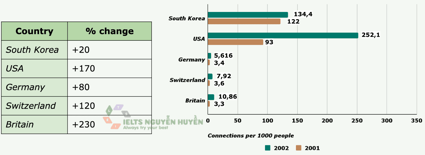 Task 1: The chart below give information about the high-speed continuous internet connection of households in five countries in 2001 and 2002