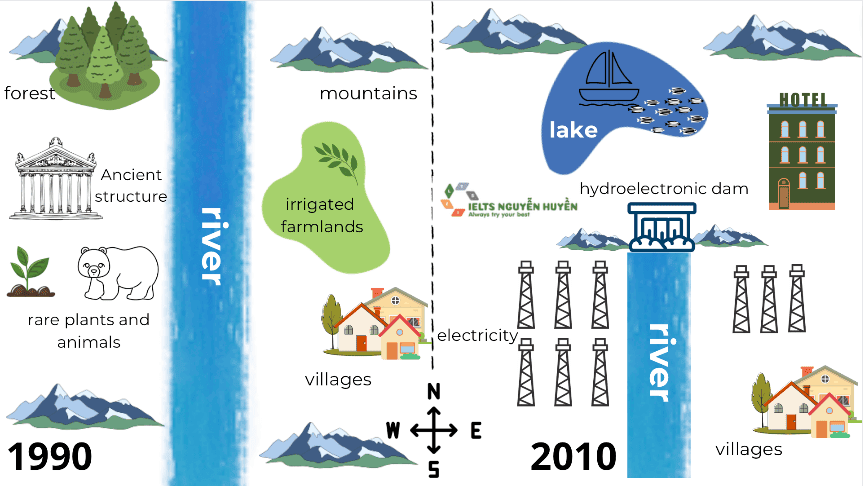 Task 1: The maps below show the changes in a town in Europe after the construction of a hydroelectric power dam. Describe the noticeable changes in the maps